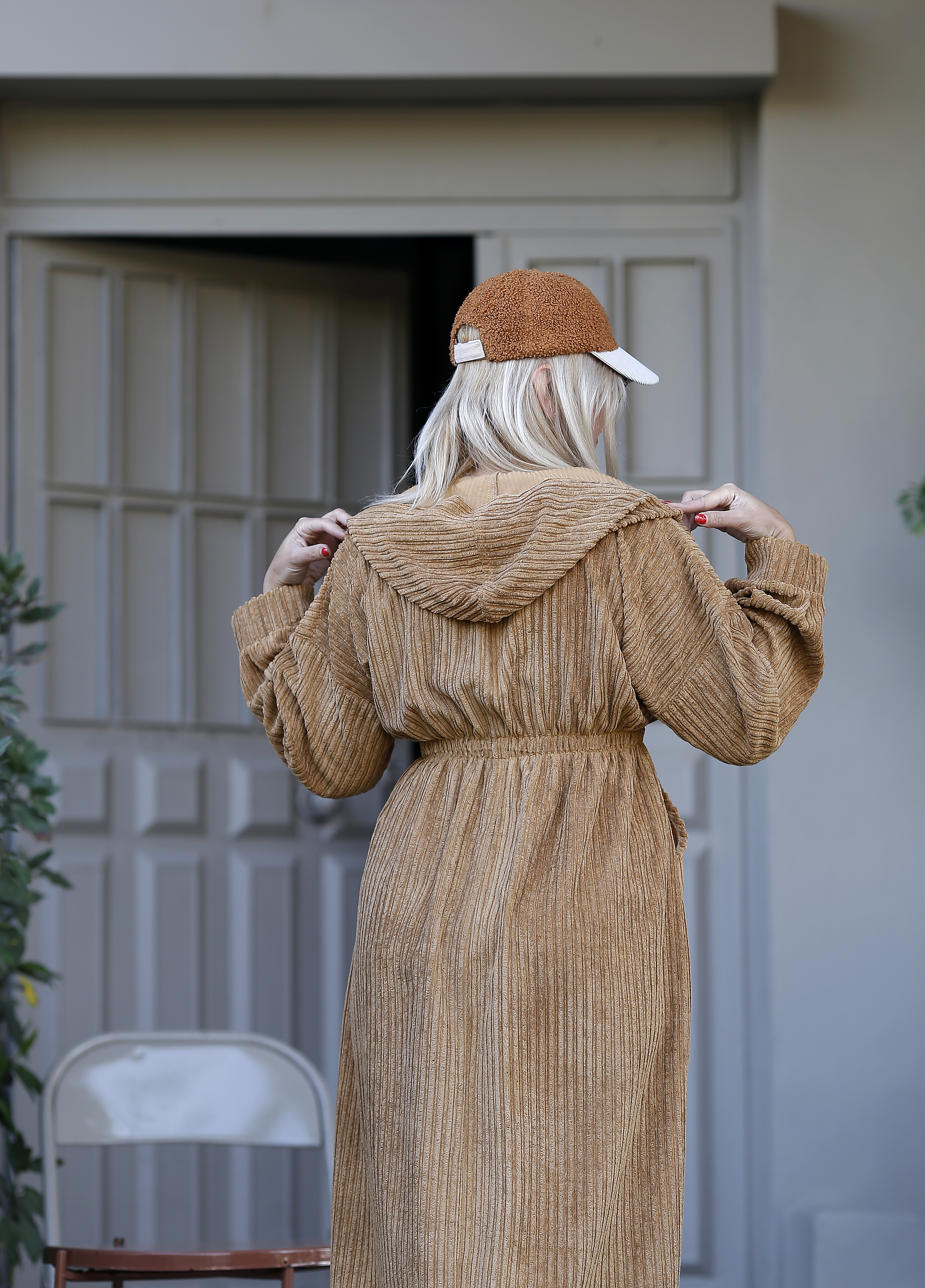 پالتو زنانه،دخترانه آرتمیس مدل ترند کلاهدار کمر کشی مخمل جنس مخمل کبریتی وارداتی خردلی